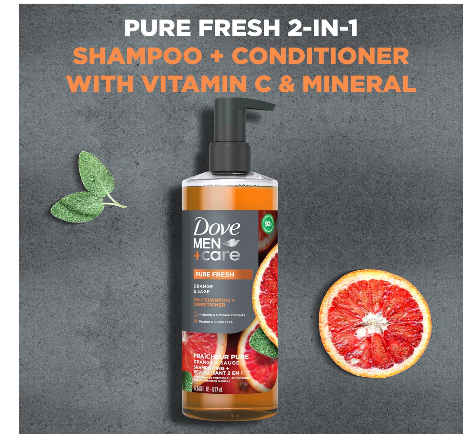 DOVE MEN + CARE 2-in-1 Shampoo + Conditioner Pure Fresh Orange & Sage for Strong, Healthy-Looking Hair, with Vitamin C & Mineral Complex, 17.5 oz